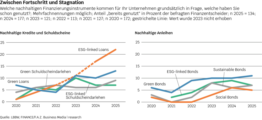 Frankfurt am Main, 17. März 2025. Unternehmen in Deutschland legen einen immer stärkeren Fokus auf nachhaltiges Handeln und Wirtschaften – die Nutzung nachhaltiger Finanzierungsinstrumente stagniert momentan jedoch. Das zeigt eine Befragung von F.A.Z. Business Media | research im Auftrag der Landesbank Baden-Württemberg (LBBW) und des Fachmagazins FINANCE unter 135 Unternehmens- und 156 Finanzentscheidern. Aufwendige Berichtspflichten und geringe finanzielle Vorteile lassen viele Unternehmen zögern. Dennoch erwarten die Befragten in Zukunft einen wachsenden Markt für nachhaltige Instrumente.