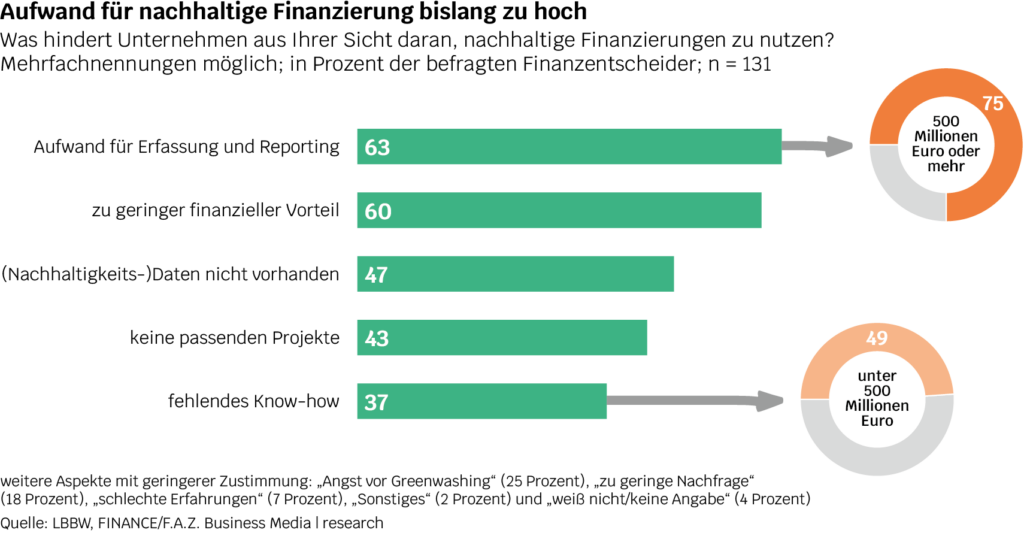 Mit Blick auf Finanzierungen geben 55 Prozent an, die unsichere wirtschaftliche Entwicklung erschwere derzeit grundsätzlich die Kapitalbeschaffung. Gegen nachhaltige Finanzierungen sprechen vor allem der Aufwand für Erfassung und Reporting (63 Prozent nennen diesen Hinderungsgrund), zu geringe finanzielle Vorteile gegenüber konventionellen Finanzierungen (60 Prozent) und die Tatsache, dass in vielen Unternehmen wesentliche Nachhaltigkeitsdaten nicht vorhanden sind (47 Prozent). Kleinere Unternehmen nennen außerdem fehlendes Know-how überdurchschnittlich als Schwierigkeit.
