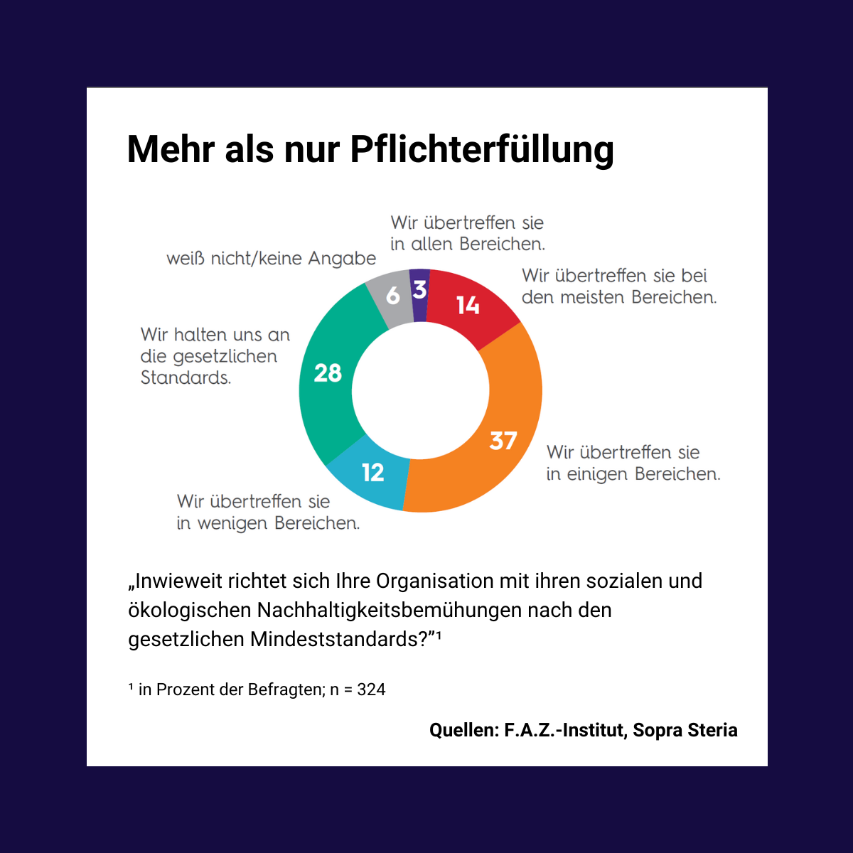 Für den begleitenden Managementkompass Survey hat F.A.Z. BUSINESS MEDIA | research zudem 371 Entscheiderinnen und Entscheider aus Wirtschaft und Verwaltung befragt. Das zentrale Ergebnis: Für die Mehrheit der Befragten gehen nachhaltiges Handeln und wirtschaftlicher Erfolg Hand in Hand.