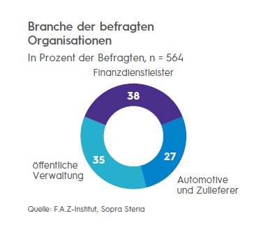 Für diese Studie von Sopra Steria und dem F.A.Z.-Institut hat F.A.Z. Business Media | research im April 2024 insgesamt 564 Personen per computergestütztem Web Interview (CAWI) befragt. Diese arbeiten in ihrer jeweiligen Organisation in Fach- und Führungspositionen und verteilen sich auf drei ausgewählte Branchen: 38 Prozent der Befragten sind bei Finanzdienstleistern tätig, darunter insbesondere Banken und Versicherungen. Rund ein Drittel stammt aus der öffentlichen Verwaltung, unter anderem aus der Kommunal-, Landes- und Bundesebene. Etwa ein Viertel gehört zum Bereich Automotive und Zulieferer.