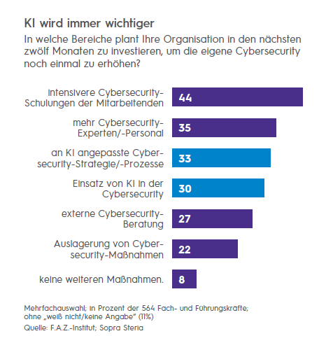 Dabei bietet KI zahlreiche Chancen, um präventiv statt reaktiv zu handeln. Mit Hilfe dieser Technologie kann es gelingen, den Angreifern einen oder mehrere Schritte voraus zu sein: KI-Anwendungen helfen bei der Mustererkennung, beim Lernen aus Daten, beim Erstellen von Lageberichten und Prognosen oder beim automatisierten Durchspielen von Analysen. Die Mehrheit der Befragten (54 Prozent) hat erkannt, dass Organisationen ohne den Einsatz von KI in der Cybersecurity in Zukunft keine Chance gegen Cyberkriminelle haben.